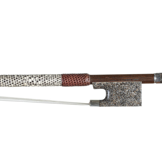 This distinctive viola bow offers exceptional playability with a distinctive aesthetic. The non-ebony frog and white lizard skin grip, replacing traditional windings, imparts unconventional visual appeal while enhancing the player's control. Its flexibility and elasticity allow for nuanced playing, making it ideal for violists seeking innovative design and superior performance.